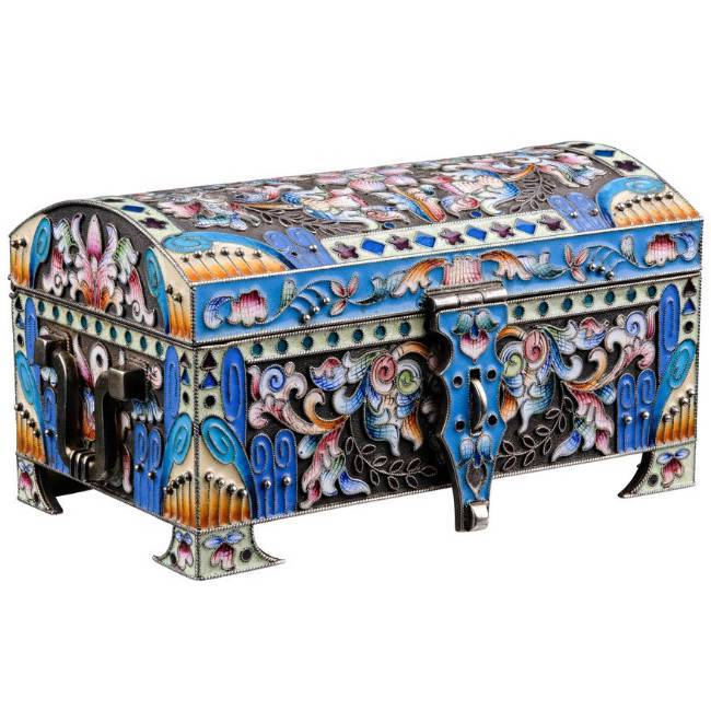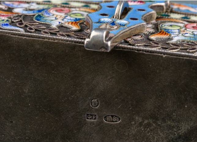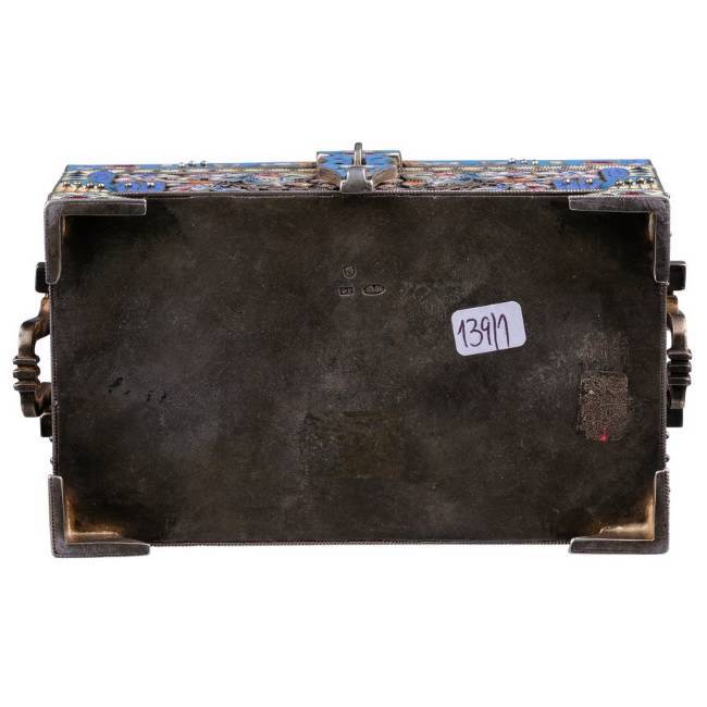 Objektbeschrieb: Moskau, 1908-1917. Meistermarke Fedor Rückert. Silber. Feingehalt 916. Wandung mit reichem Cloisonné-Dekor. Inseitig vergoldet.
