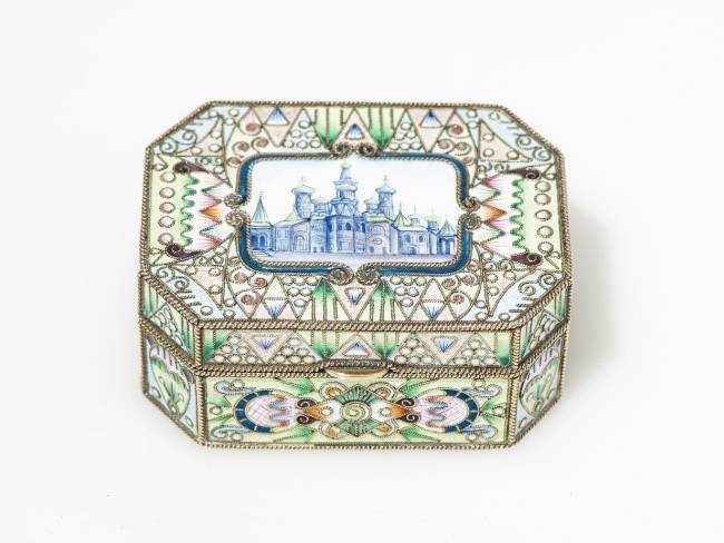 Boîte à pans coupés en émail cloisonné ornée sur le couvercle d'une vue du Kremlin en camaïeu bleu, Fedor Ruckert, Moscou, 88 Kokoshnik, 1908-1917, vermeil et émail, L 7 cm, 160g