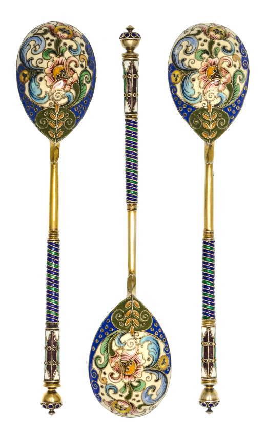 Three Russian Silver-Gilt and Enamel Teaspoons