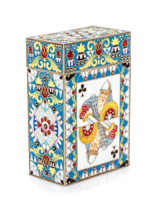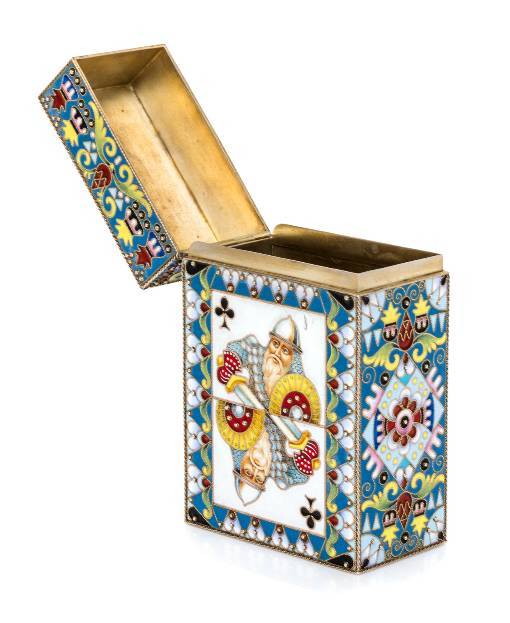 A Russian Silver-Gilt and Enamel Card Box Spurious marks of Fedor Ruckert, Moscow, early 20th century the box decorated with polychrome foliate and geometric decoration throughout, the sides with enamel plaques depicting the King of Clubs. marked on underside 6 ozt 19 dwt gross Height 4 x width 2 5/8 x depth 1 1/2 inches.