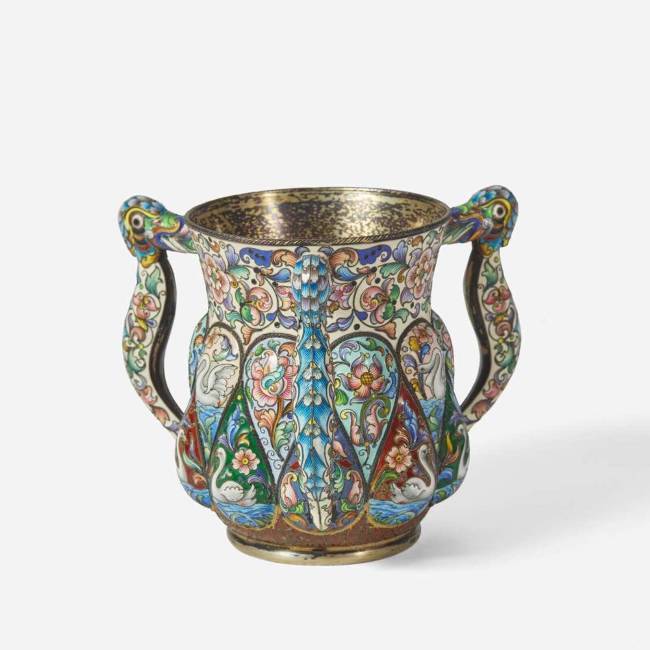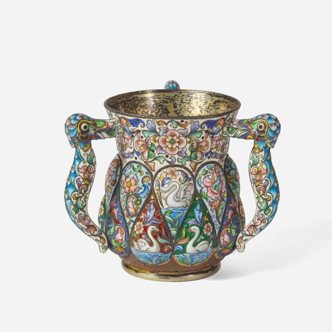 A Russian silver-gilt and shaded enamel three-handled cup Partially