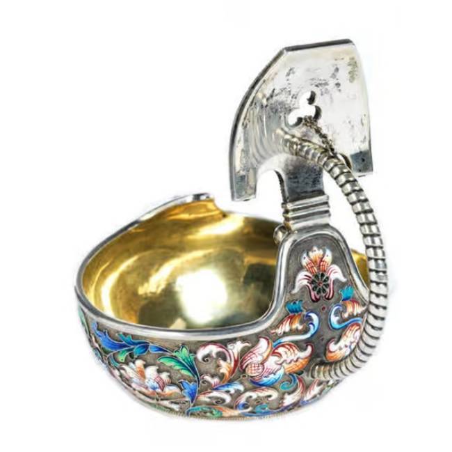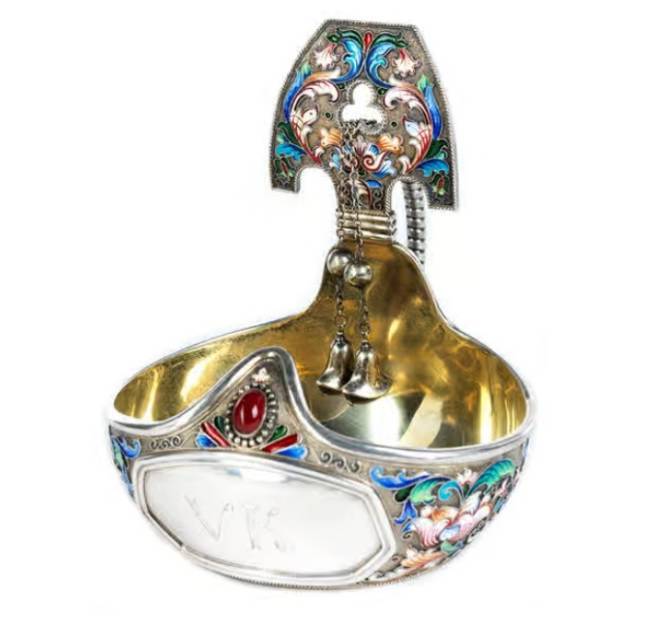 Silver, chased, cast, gilded, engraved. Enamel and colored stone. Above a short, gadrooned base, the muggled body with interior gilding. Handle in the form of a gadrooned C attached to the raised, angled body. Body with rich cloisonné decoration and a central frontal cartouche with the engraved monogram “VK”. Two suspended chains with bell-shaped weights. (1021685) (13)
