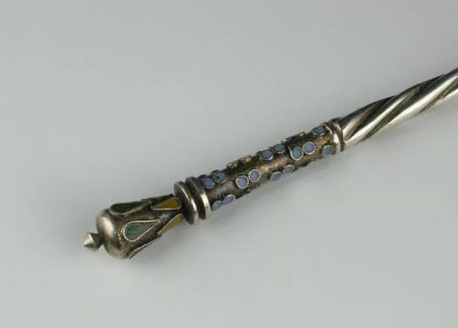 Deep bowl, long stem, spirally twisted in the middle. Cloisonné decoration in light blue, dark blue, iron red, manganese, ochre, and green on a white ground on the underside of the bowl and at the end of the handle. Marked "Werkmeister Theodor Rückert". 84 silver mark. (690201)