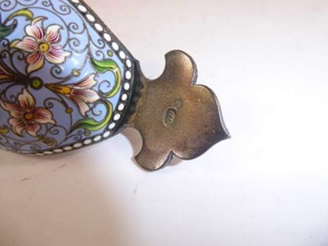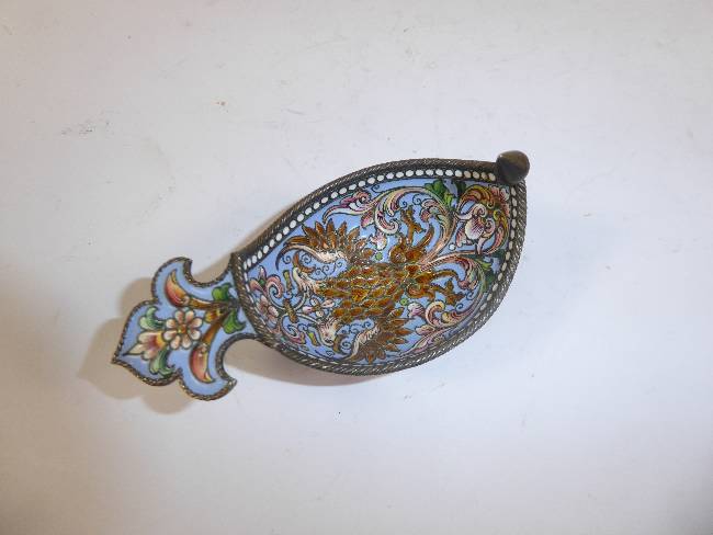 oval and on spreading conforming foot, with vari-coloured cloisonne enamel on a pale blue ground, the interior featuring a double-headed eagle within foliage and flowers, the outside and the handle with further foliage and flowers, with white enamel beaded borders, tapering finial and corded borders