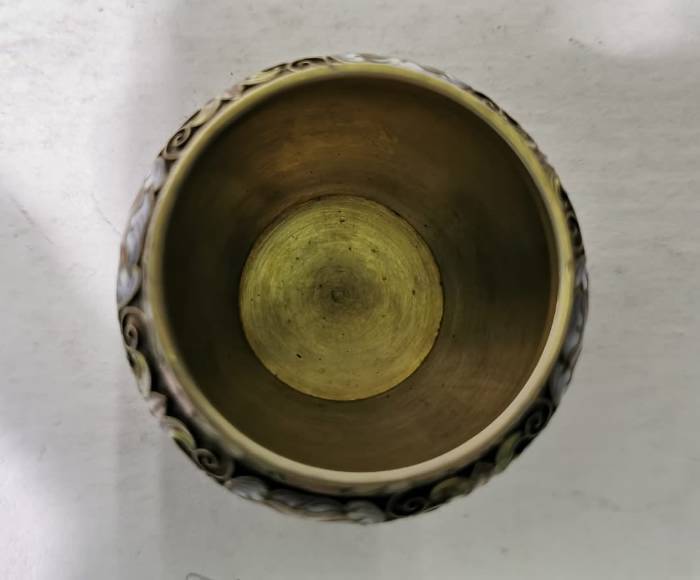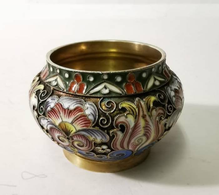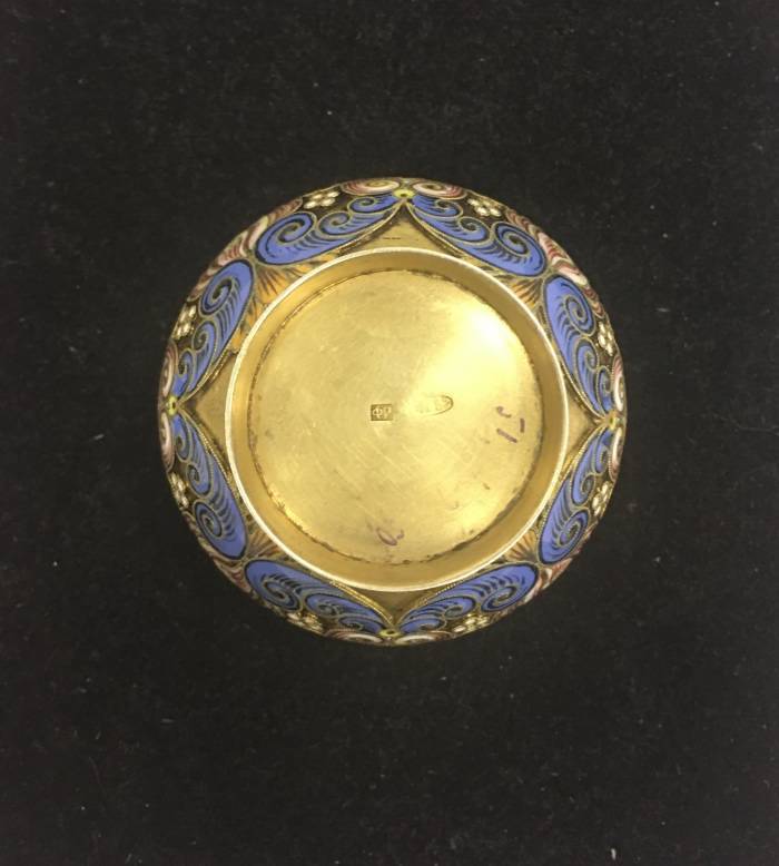 Солонка, серебро 84 пр. Перегородчатая, росписная эмаль. Именник Ф.Р. (Федор Рюкерт). Россия, конец 19 нач 20. Диаметр 5,5 см. Вес 51,10