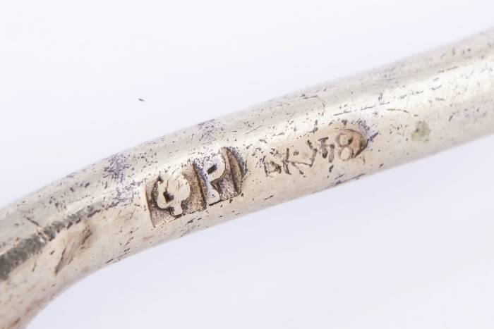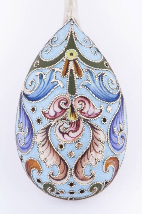 Клейма: 84 проба, клеймо «ФР», «женская голова в кокошнике, обращенная влево». Украшена вензелем.