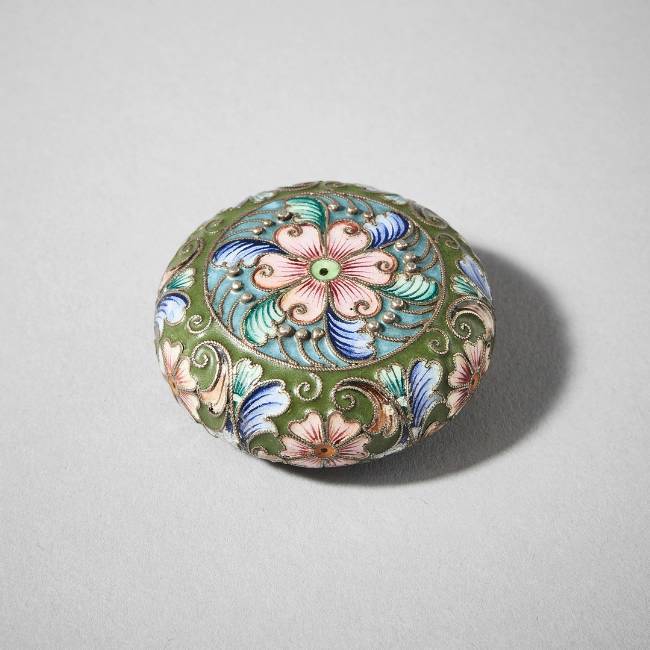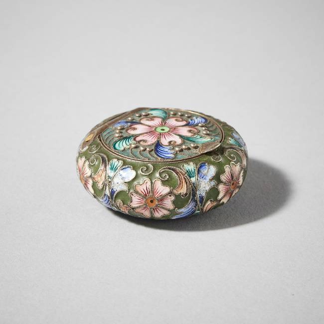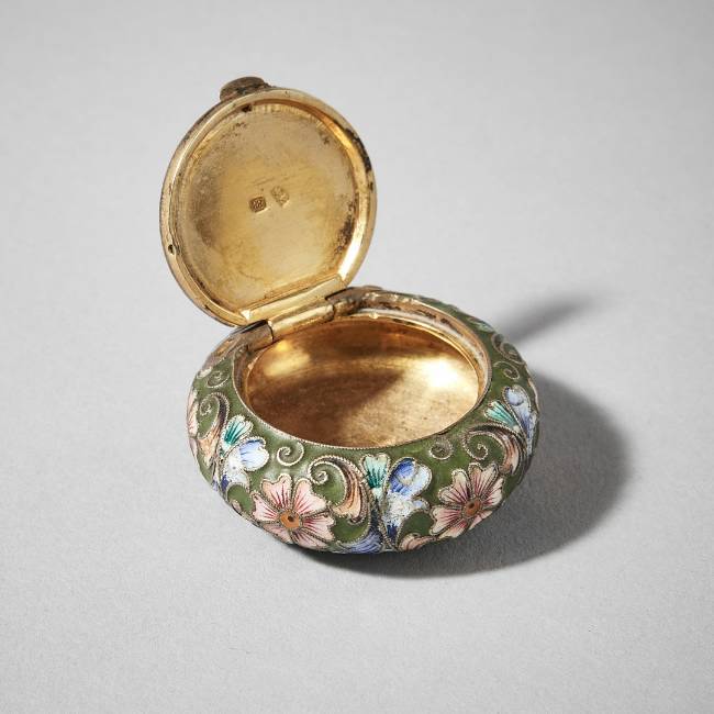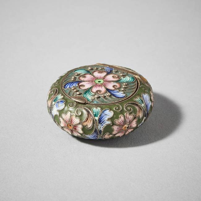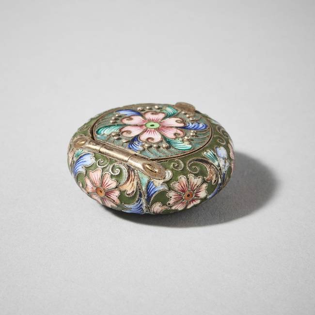 Fine Art & Antiques Autumn 2022 6 December 2022 305. 2296114. FEODOR RÜCKERT. A Feodor Rückert silver-gilt and cloisonnée enamel pill-box, Moscow 1896-1908.