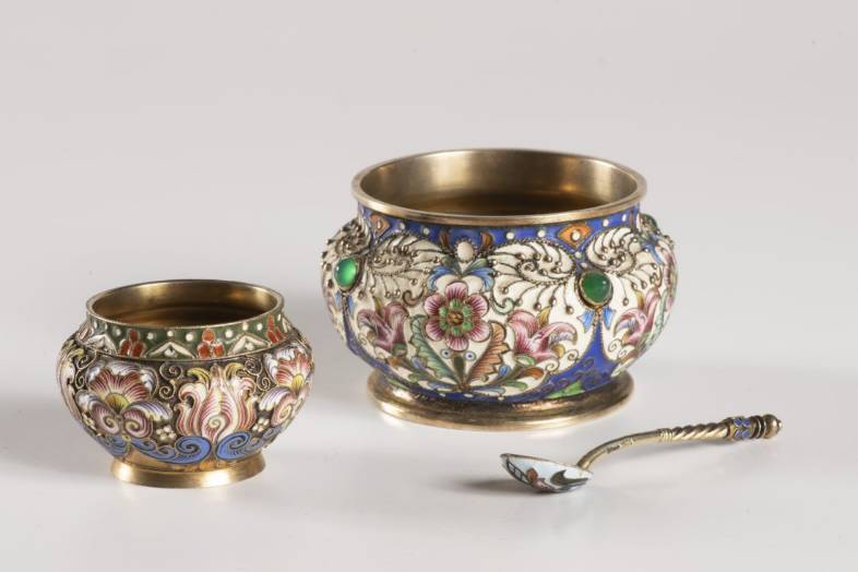 Zlacené stříbro "vermeil", polychromovaný cloisonné email