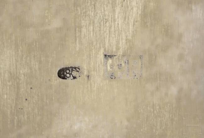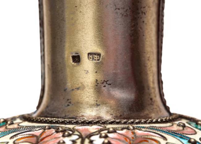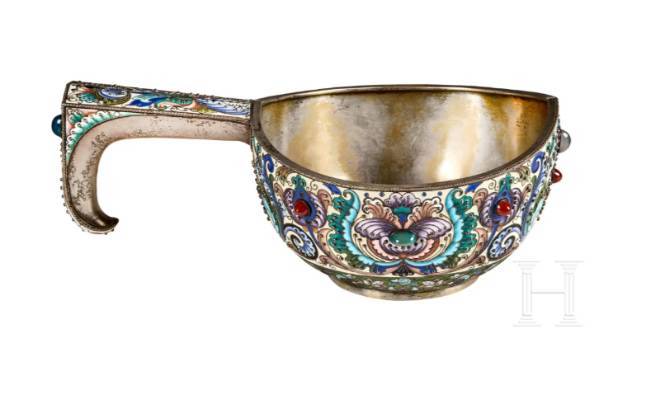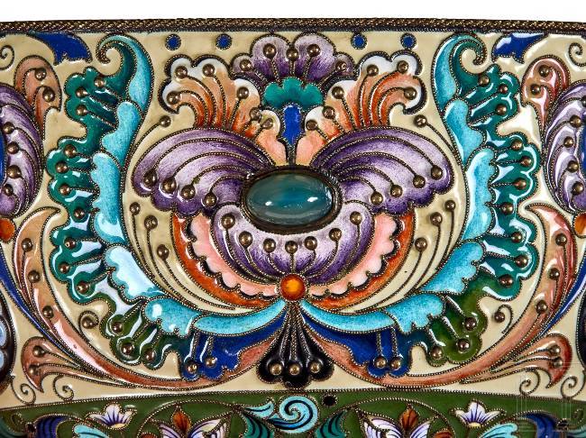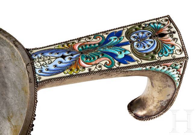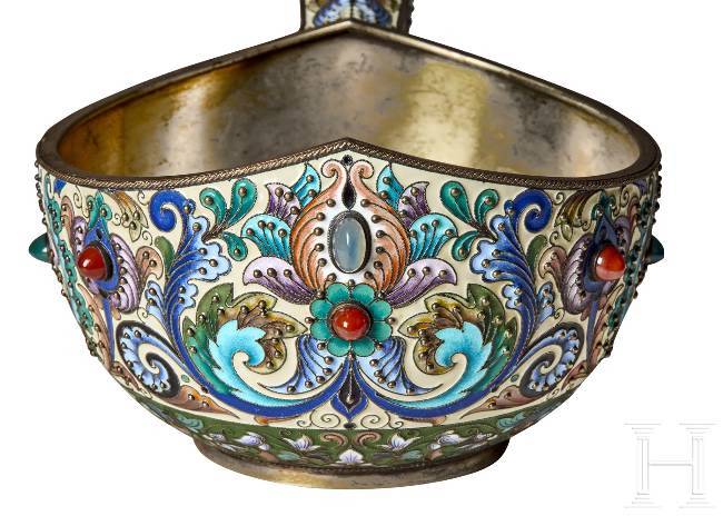 Gilt silver. The bulbous body embellished all over with leafy vines and stylised floral motifs in very finely shaded cloisonné enamel on a mostly cream-coloured, partly green background. Seven decorative cabochons arranged around the edge. The underside and handle stamped with the mark of district inspection administration, fineness "88" plus master's mark "F.R." in Cyrillic. Length 24 cm, total weight 601g. Although Feodor Rückert worked independently in his own workshop, most of his production was distributed by Fabergé.
