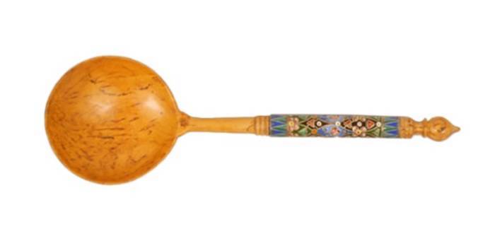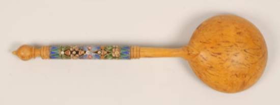 A Russian turned and carved birchwood serving spoon with a silver gilt and cloisonne enamel handle, Feodor Ruckert, Moscow, circa 1900. The handle worked in a multi-color geometric mosaic pattern. Length: 7 5/8".