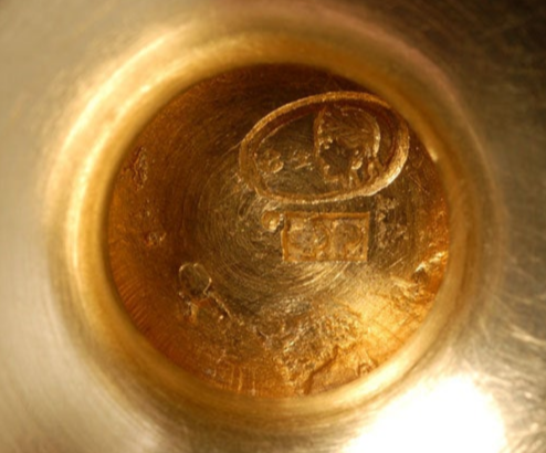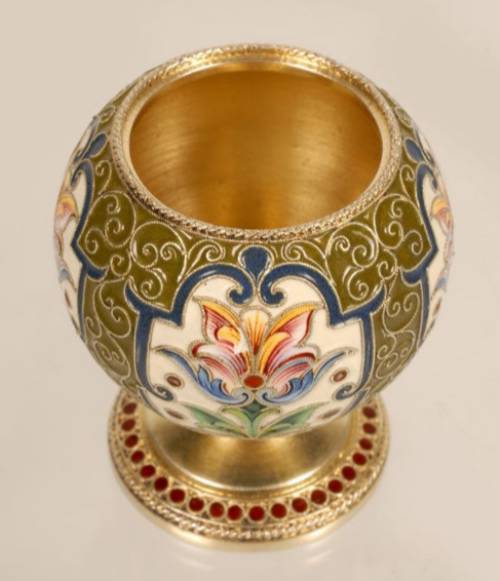 A Russian silver gilt and cloisonne enamel vodka cup, Feodor Ruckert, Moscow, 1896-1908. The bulbous body worked in multi-color stylized foliate cartouches on a cream ground surrounded by olive green enamel set with scrolling filigree wires . The raised circular base banded with a circle of red enamel beads. Dimensions: 2 1/4" H x 1 7/8" W.