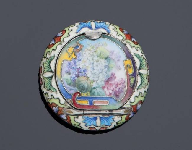 De forme ronde, à décor d'un motif floral sur fond crème, entièrement en émaux polychromes cloisonnés. Le couvercle à charnières orné d'une plaque émaillée d'un bouquet de fleurs, intérieur vermeil. Bon état.