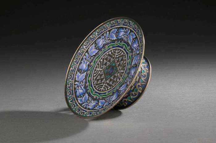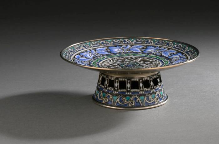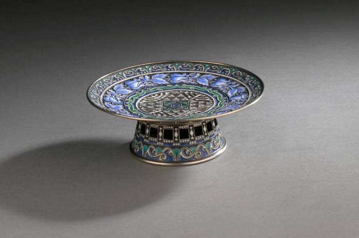 FABERGÉ Rare Art Nouveau-style 88 zolotniks (916 thousandths) silver and polychrome, blue, green and white cloisonné enamel tazza bowl, with five-register tapestry decoration of Greek friezes and scrolls, wavelets and naturalistic plant scrolls, left in reserve on a sand-blasted background; resting on an openwork truncated-conical foot decorated en suite. Very good condition. Moscow, 1899-1908. Goldsmith: Feodor RÜCKERT for Carl Fabergé, supplier to the Imperial Court. Fabergé engraved inventory number: 23087. H. 5.5 x D. 15 cm. Gross weight: 260 g. Related work A similar tazza with an openwork foot, by Feodor Rückert, Moscow, 1908-1917, sold at Sotheby's, New York, November 4, 2010, lot 13 (sold for $31,250).