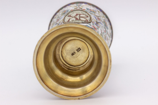 Feodor Ivanovich Rückert (Friedrich Moritz Rückert); (Alsacia, 1840-Moscu, 1918) . Vaso en plata vermeil de 88 zolotnik (916 mm) profusamente decorado con esmalte cloisonné de motivos florales orlando reserva con cetrero y monograma en cirílico (XB). 12,9x7x7 cm. 182 gr. Lig. desperfecto en el esmalte. Marcas del platero y ley de pureza en la base.