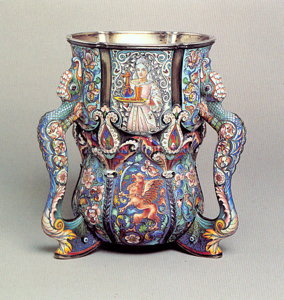 The waisted cylindrical bowl with slightly lobed panels, the lower half with vari-colored stylized flowers alternating with en-plein sword-wielding griffins, the top half with folkloric figure, a musician and a young woman wearing a kokoshnik, each handle terminating in undulating serpent's head with amethyst eyes (chipped)