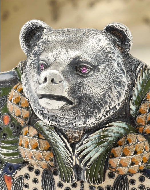Oval with rounded sides on a spreading foot, the ends with handles in the form of bear heads, their eyes set with small cabochon rubies, the body with filigree flowers and foliate scrolls enameled in dark green, blue, white, orange, and yellow, marked on underside with maker's initials