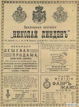 К 1900 Л. стал поставщиком дворов короля Румынского, князей Болгарского и Черногорского, позже - двора шаха Персидского. Был склонен к мистификациям. Пользуясь тем, что государственные гербы Черногории и Российской империи имели некоторое сходство, незаконно помещал на своих прейскурантах и рекламе малый герб России, жалуемый поставщикам Российского Императорского двора. После вмешательства канцелярии Министерства Императорского двора и петербургского градоначальника письменно обязался впредь не пользоваться официальной атрибутикой и не вводить публику в заблуждение. В 1912 издал роскошный каталог бриллиантовых, золотых изделий и прочих вещей (свыше 1 500 рисунков), имевшихся в его магазине, в 1913 опубликовал тиражом 100 тыс. экземпляров свою книгу «Дом Романовых. Памятка русскому народу», которую бесплатно выдавали каждому посетителю его магазина. В 1900-х гг. одновременно директор товарищества «Ново-граммофон», торговавшего граммофонами, пластинками и «музыкальными ящиками». Почётный член Московского Императорского археологического института, член Комитета по устройству празднования 300-летия Дома Романовых (с 1912), староста церкви Святого князя Александра Невского при Николаевском кадетском корпусе. Член Российского общества покровительства животным. Чтобы избежать очередного погрома, которому подвергся его магазин как немецкий в начале Первой мировой войны, Л. в конце 1914 изменил написание фамилии на «Линд'ен», в 1915 опубликовал свою лубочную книжку «Повесть в лицах о славном муже Николае, зовомом Линден, зело полезна», в которой выводил свой род от выходца из Швеции Олафа, якобы прибывшего в Россию при великом князе московском Василии I. В 1915 его торговый дом именовался товарищество на вере «Николай Линден и К». С. Винокуров (С.-Петербург) ([источник]) История и интересные факты Любопытно, что герб Черногории, который использовался в его рекламе похож на герб Российской Империи. К 1900 Линден стал поставщиком дворов короля Румынского, князей Болгарского и Черногорского, позже - двора шаха Персидского. Был склонен к мистификациям. Пользуясь тем, что государственные гербы Черногории и Российской империи имели некоторое сходство, незаконно помещал на своих прейскурантах и рекламе малый герб России, жалуемый поставщикам Российского Императорского двора. После вмешательства канцелярии Министерства Императорского двора и петербургского градоначальника письменно обязался впредь не пользоваться официальной атрибутикой и не вводить публику в заблуждение. |