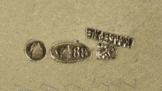 Клейма: «К. Фаберже» под государственным гербом, проставленным поверх клейма мастера, тройник Московского окружного пробирного управления — женская головка в кокошнике, обращенная вправо, с пробой для изделий из серебра «88» и шифром округа — греческой буквой дельта, знак удостоверения Московского окружного пробирного управления — женская головка в кокошнике, обращенная вправо, с точкой сзади шеи, в круге