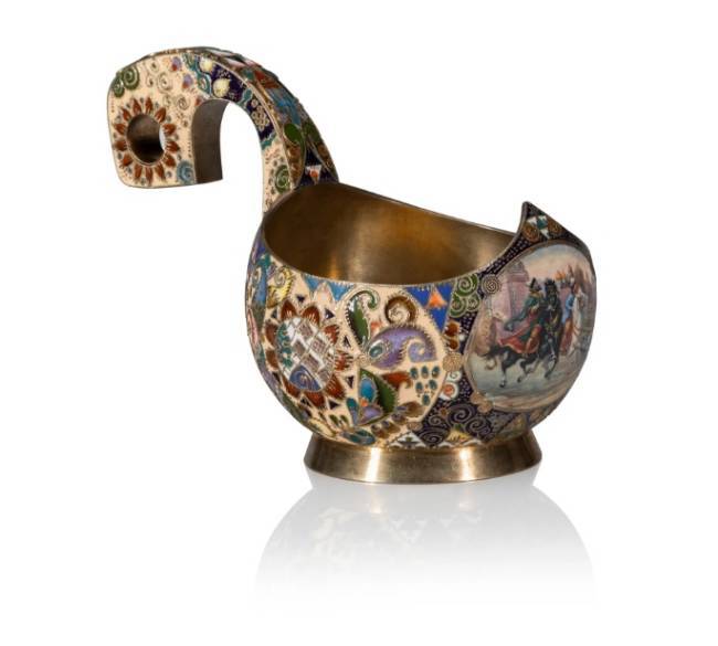 A Russian Pan-Slavic Cloisonné and En Plein Enameled Gilt Silver Pictorial Kovsh Fabergé, Attributed to Feodor Rückert, Moscow, 1908-1917 4 x 3-3/8 x 5-7/8 inches (10.2 x 8.6 x 14.9 cm) 234 grams