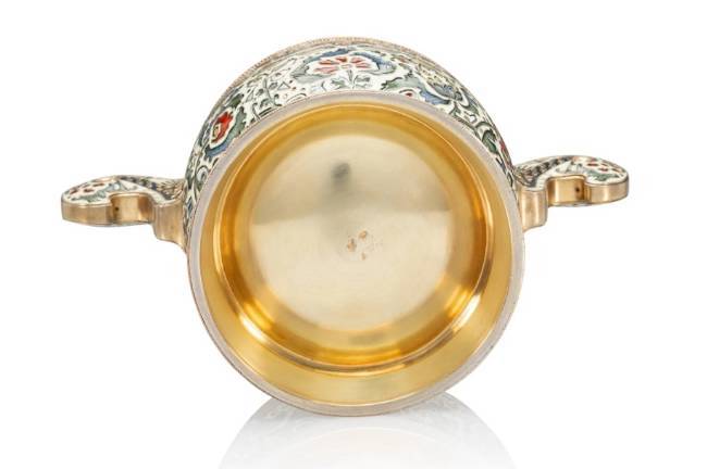 A FABERGE SILVER-GILT AND CLOISONNE ENAMEL BRATINA, WORKMASTER: FEDOR RUCKERT, MOSCOW, 1899-1908