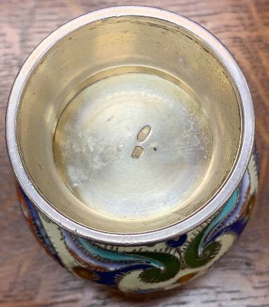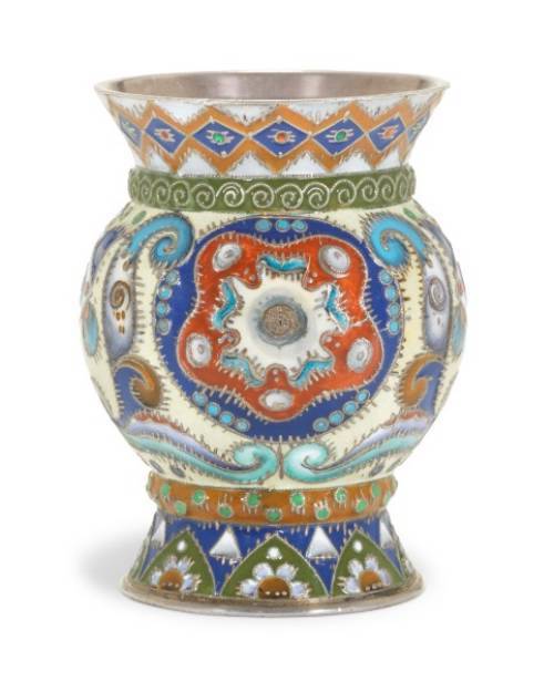 Of bulbous form, on a spreading foot, the tapering lip enamelled with a diamond pattern above a scrolling wirework rim, the body with two rosettes surrounded by geometric motifs, on a cream ground, above a foliate rim, marked under base, also with later Soviet marks