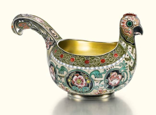 A silver-gilt and cloisonné enamel cockerel-form kovsh, Feodor Rückert, Moscow, 1899-1908