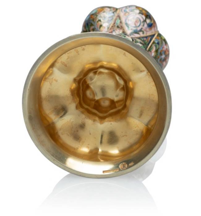 ICHOLAS II IMPERIAL PRIZE: A FINE RUSSIAN SILVER AND SHADED ENAMEL CUP AND COVER, FEODOR RUCKERT, MOSCOW, RETAILED BY OVCHINNIKOV, CIRCA 1890