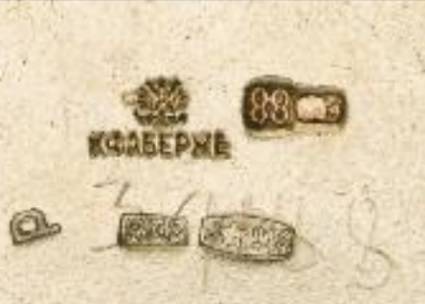 the bulbous bowl decorated with Pan-Slavic ornament in blue, red and white enamel, flanked by stylised handles, marked K. Faberge beneath the Imperial warrant,