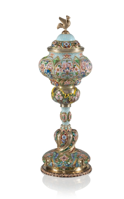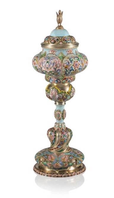 A Russian Shaded Cloisonné Enameled Gilt Silver Cup and Cover Khlebnikov, Feodor Rückert marks overstruck and partially effaced, Moscow, 1899-1908 14-5/8 x 5 inches (37.1 x 12.7 cm) 1256 grams