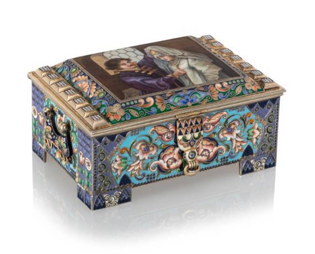 A Russian En Plein and Cloisonné Enameled Gilt Silver Casket after Makovsky's Boyar Wedding Feodor Rückert, Moscow, 1908-1917, with scratched inventory number 2785C 2-3/4 x 5-3/4 x 4-1/8 inches (7.0 x 14.6 x 10.5 cm) 734 grams