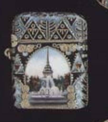 Oblong, the sides with an en-plein plaque of the Admiralty Tower before a fountain with cloisonne geometric motifs in pale and dark blue embellished with rope work scrolls, the base with striker, the hinged cover with similar motifs, with suspension ring, marked on flange