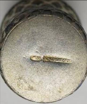 Клейма: мастера – ФР; фирмы – О. КУРЛЮКОВЪ, проставленное поверх клейма мастера; тройник московского окружного пробирного управления– женская головка в кокошнике, обращенная вправо, с пробой для изделий из серебра – 88 и шифром округа греческой буквой дельта