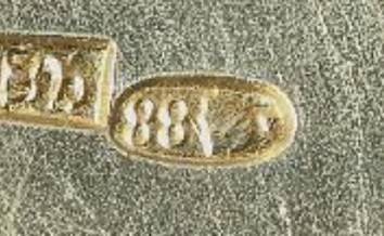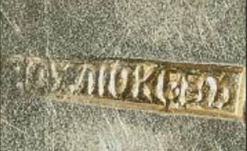 Клейма: мастера – «ФР»; фирмы – «…РЛЮКОВЪ» (пробито нечетко, дважды); тройник Московского окружного пробирного управления – женская голова в кокошнике, обращенная вправо, с пробой для изделий из серебра – 88 и шифром округа – греческой буквой «дельта».