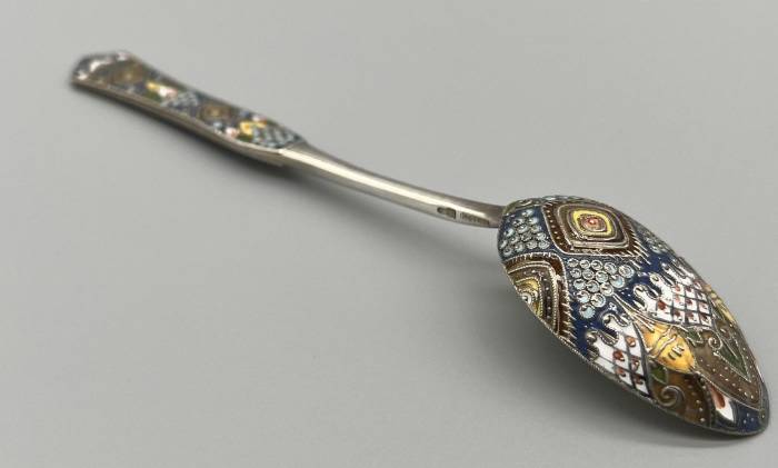 Серебро, эмаль по скани, амальгама, штамп, монтировка, золочение. Дл. 14,5 см, ш. чашечки 2,6 см.