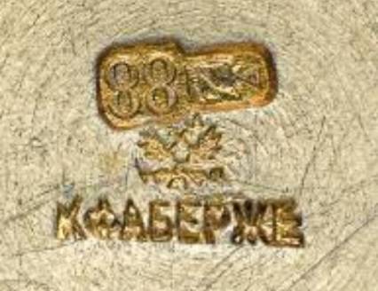 Клейма: фирмы – К. Фаберже под Государственным гербом; тройник Московского окружного пробирного управления – женская головка в кокошнике, обращенная вправо, с пробой для изделий из серебра – 88 и шифром округа греческой буквой дельта, в щитке в форме лопатки; процарапанный фирменный инвентарный номер – 39472