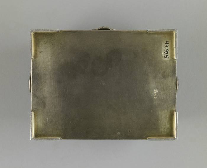 Portrayed is an event that had occurred during Russia's "Time of Troubles" in the early 17th century. The merchant Kuzma Minin stands in the town square exhorting the citizens of Nizhnii Novgorod to donate their valuables in order to finance a volunteer army. Even the children in the foreground are surrendering their toys. Led by Prince Dmitrii Pozharskii (1577-1642), the army expelled the Poles from Moscow in August, 1612. The victory resulted in Michael Romanov being elected tsar the following year, thereby founding the Romanov dynasty. This box was probably intended to commemorate the Tercentenary of the dynasty in 1913. The outward flaring sides of the box are decorated in painted enamel with patterns of cloud berries and curvilinear motifs as well as with tightly wound filigree and distinctive hatch marks.