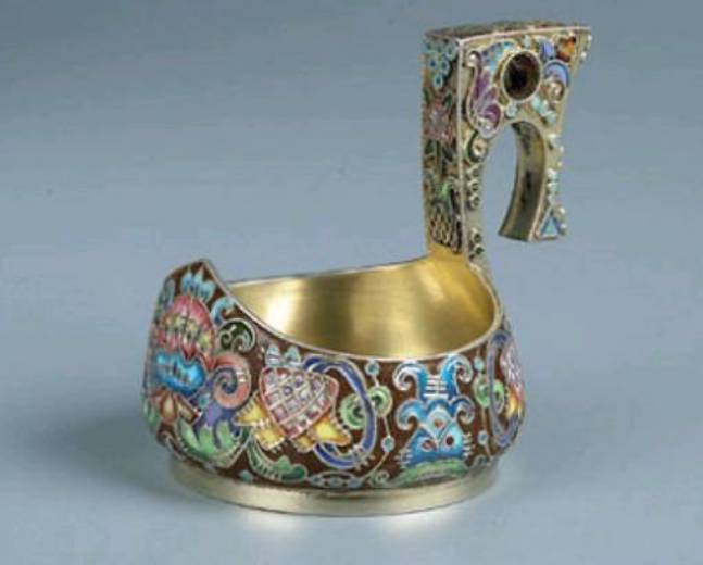 A silver-gilt diminutive kovsh with shaded cloisonne enamel with a pierced raised handle reminiscing an elephant, the kovsh is decorated with scrolling foliage on dark brown ground.