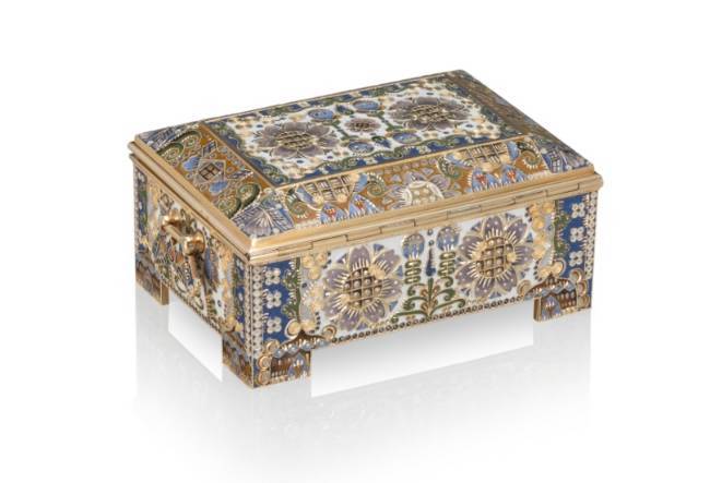 A Russian Pan-Slavic Enameled Gilt Silver Casket, Larets Kurlyukov, Attributed to Feodor Rückert, Moscow, 1908-1917