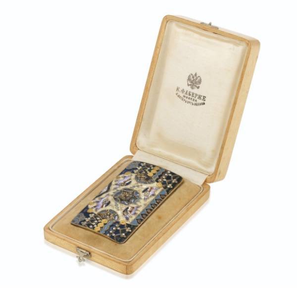 Rectangular, cloisonné enamelled with stylised foliate and geometric design in shades of blue, purple, green, brown and beige, marked on the reverse with workmaster's initials; in the original fitted Fabergé wooden case