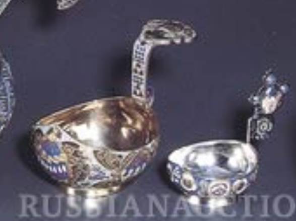 One silver-gilt kovsh decorated with vari-colour motifs on light-grey ground, with stylised handle applied with pan-slavic motifs, decorated on the border with polychrome blossoms, on blue ground, with a stylised shaded enamel openwork handle