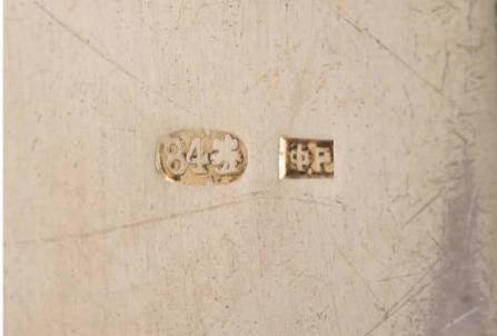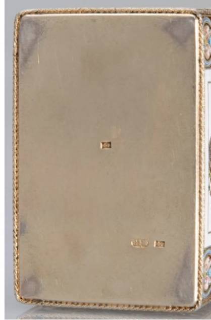 A Russian silver-gilt and cloisonne enamel card case Fedor Ruckert, Moscow, circa 1890 decorated with the King of Spades, and the Queen of Diamonds, each on a white ground and within stylized floral and scroll border, the top of the hinged cover with a medallion beneath the imperial eagle, decorated with the pious pelican and with Russian inscription 'For the benefit of the Imperial Foundling School', gilt interior with two compartments, scratched number 2410