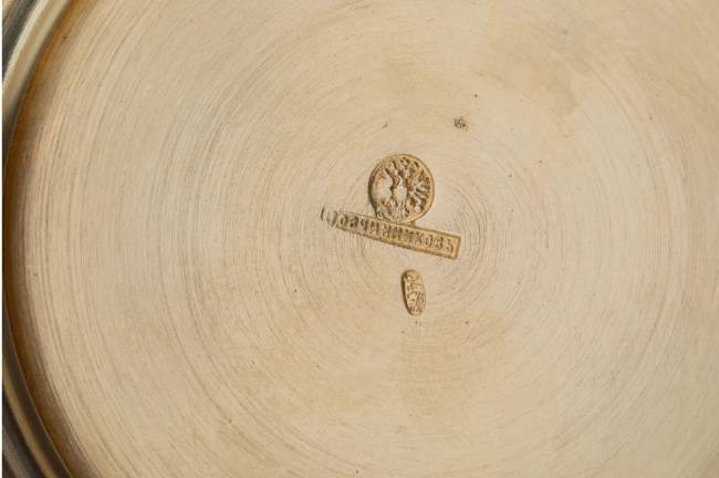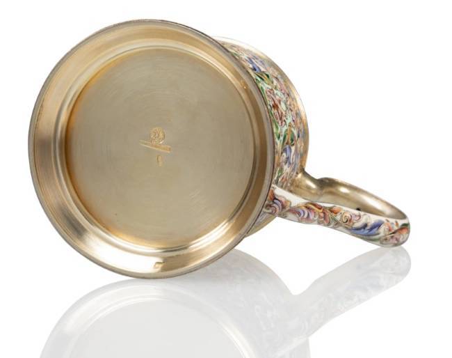 A Russian Shaded Cloisonné Enameled Gilt Silver Tea Glass Holder, Podstakannik Ovchinnikov, Feodor Rückert, Moscow, 1899-1908 3-7/8 x 4-5/8 x 3 inches (9.8 x 11.7 x 7.6 cm) 195 grams