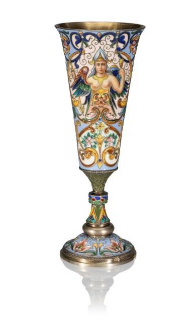 A Russian Enameled Gilt Silver Champagne Flute with a Miniature of a Sirin Ovchinnikov, Feodor Rückert, Moscow, before 1899 6-1/2 x 2-1/2 inches (16.5 x 6.3 cm) 183 grams