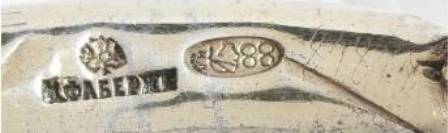 the underside of the bowl decorated with a diaper pattern of triangles shaded with swirls on a stippled ground within scrolls and rosettes, the flared handle with geometric motifs and a plique-à-jour flowerhead, struck K.Fabergé in Cyrillic beneath the Imperial Warrant, 88 standard, scratched inventory number 22868, Soviet control marks