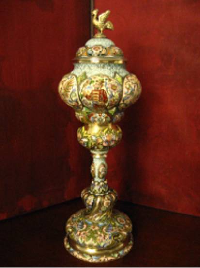 Знаменитый русский позолоченный серебряный кубок с крышкой, выполненный Федором Рукертом в Москве в 1906 году. Подарок царя Николая II и царицы Александры Федоровны ее брату, великому князю Гессенскому.
