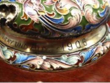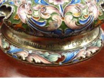 Алиса, которую называли Аликс, принцесса Гессенская и Рейнская (1872–1918), вышла замуж в 1894 году за своего двоюродного брата, 2-го класса, 2-го поколения. Ее брат, великий князь Эрнст Людвиг Гессенский (среди друзей его называли Эрни), часто путешествовал по Санкт-Петербургу (за исключением Аликс, которая была еще одной из его сестер). Мотивом принятия кубка является напоминание об общем опыте охоты. Его зять, царь Николай II, в своих мемуарах (Эллисон) упоминает, что великий князь Гессенский и Рейнский Рейн: запись) как «Ники», он был очень близок — так, например, на стр. 14 речи «его (их) частые поездки в Англию, после того как Петербург вознаградил его братом» или «стр. 79» «Мне очень повезло, что мои братья были моими Швгерами (...)». Чаша. См. Александр фон Солодков, Русское ювелирное искусство, стр. 140, № 207, стр. 194. Большая часть его работ относится к коллекции Фаберже. Происхождение: По словам коллекционера, чаша после революции датских родственников царского дома была «сохранена» и доставлена из Дании в крупную частную шведскую коллекцию, приобретенную у коллекционера там.