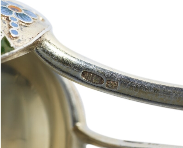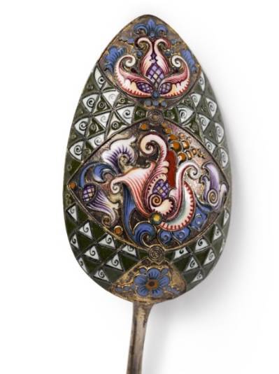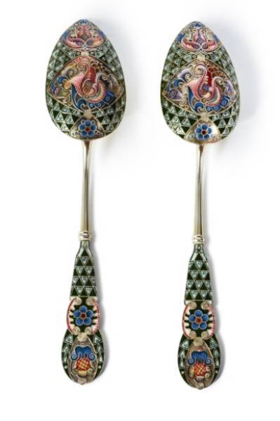 A Pair of Silver-Gilt and Cloisonné Enamel Spoons, Workmaster Fedor Rückert, Moscow, 1908-1917