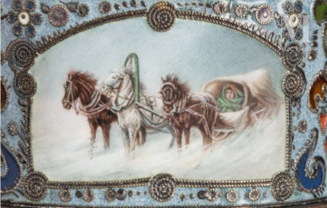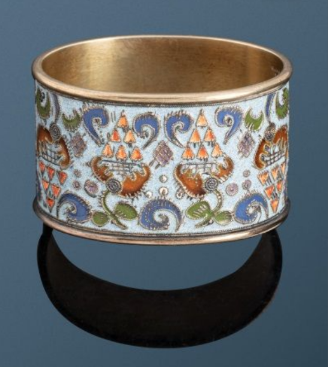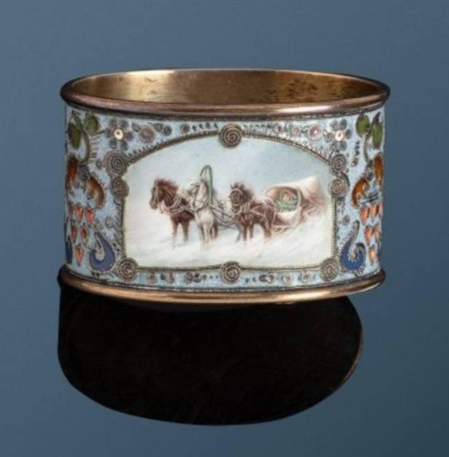 Кольцо для салфетки из позолоченного серебра 88-й пробы, покрытое полихромной перегородчатой эмалью на небесно-голубом фоне, украшенное геометрическими узорами и эмалированной сценой в виде тройки на снегу в соответствии со знаменитой почтовой открыткой дореволюционной эпохи «Сибирская Тройка», изданная в Петербурге около 1900 года. Внутри выгравировано имя «Наташа» на русском языке.