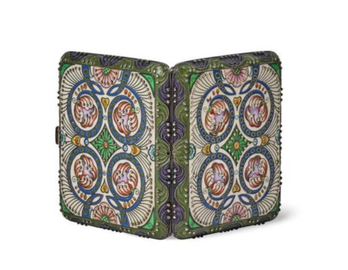 Étui à cigarettes en argent 84 zolotniks (875 millièmes) à décor émaillé polychrome cloisonné figurant des fleurs stylisées s’enroulant