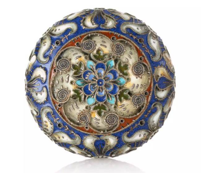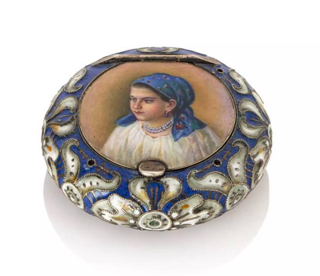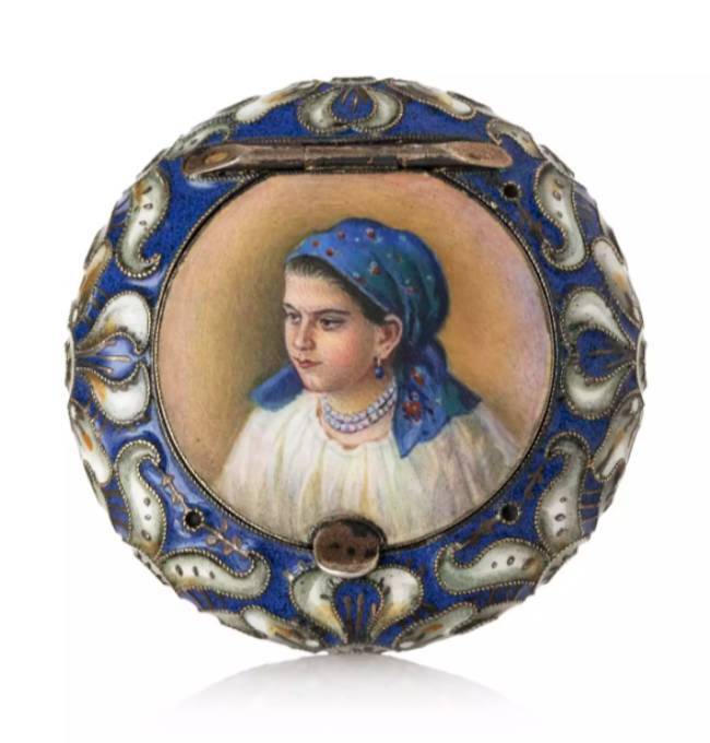 Boîte à pilules de forme ronde en argent 88 zolotniks (916 millièmes) émaillé polychrome cloisonné sur fond bleu marine, à décor de motifs géométriques, de fleurs et de rinceaux stylisés. Le couvercle s’ouvrant à charnière, orné d’une scène émaillée en plein figurant le portrait d’une jeune femme russe d’après l’œuvre d’Ivan Semenovich Kulikov (1875-1941) intitulé Parasha et datant de 1901. Intérieur vermeil.